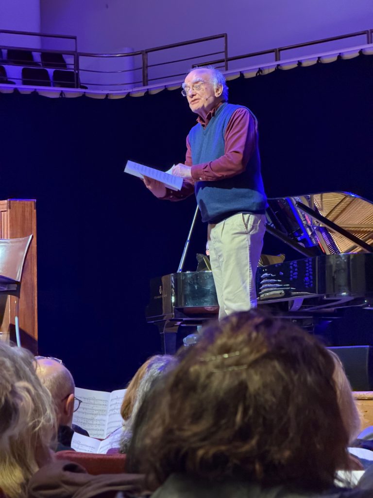 His anecdotes entertained us and gave us an insight into the commissioning process. David Attenborough happily gave him flexibility for a work to mark the 70th anniversary of the Council for the Protection of Rural England. This led to Look at the World. The duration of a gap in a BBC Singers’ programme for a Proms concert gave John a restricted timeframe to fill – timing is everything with live radio! This resulted in Bird Songs. We enjoyed three excerpts from that and two from his folksong influenced Dancing Tree. And given Rufus (who we hope lives a long life), we also sang Gibbons’ sublime The Silver Swan.