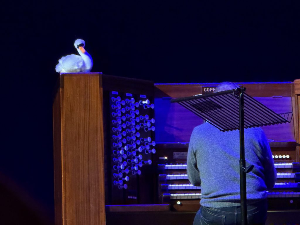 Rufus the swan is well-known to social media followers of Sir John Rutter. An affectionate ‘Ah’ came from hundreds of singers when John pulled a cuddly Rufus out of a bag! John has run workshops in the city for many years, always in support of the Nottingham Refuge Forum. We heard a moving account of the Forum’s work from someone who, as a refugee, had found welcome, sanctuary and recovery in Nottingham.